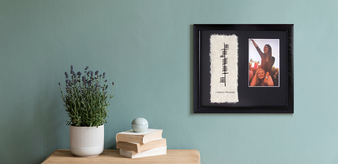 This piece looks great on it’s own or in a group with your family’s names. Each Ogham Wish is hand-painted by Ethel Kelly onto hand-made paper, and framed in a contemporary black wooden frame.