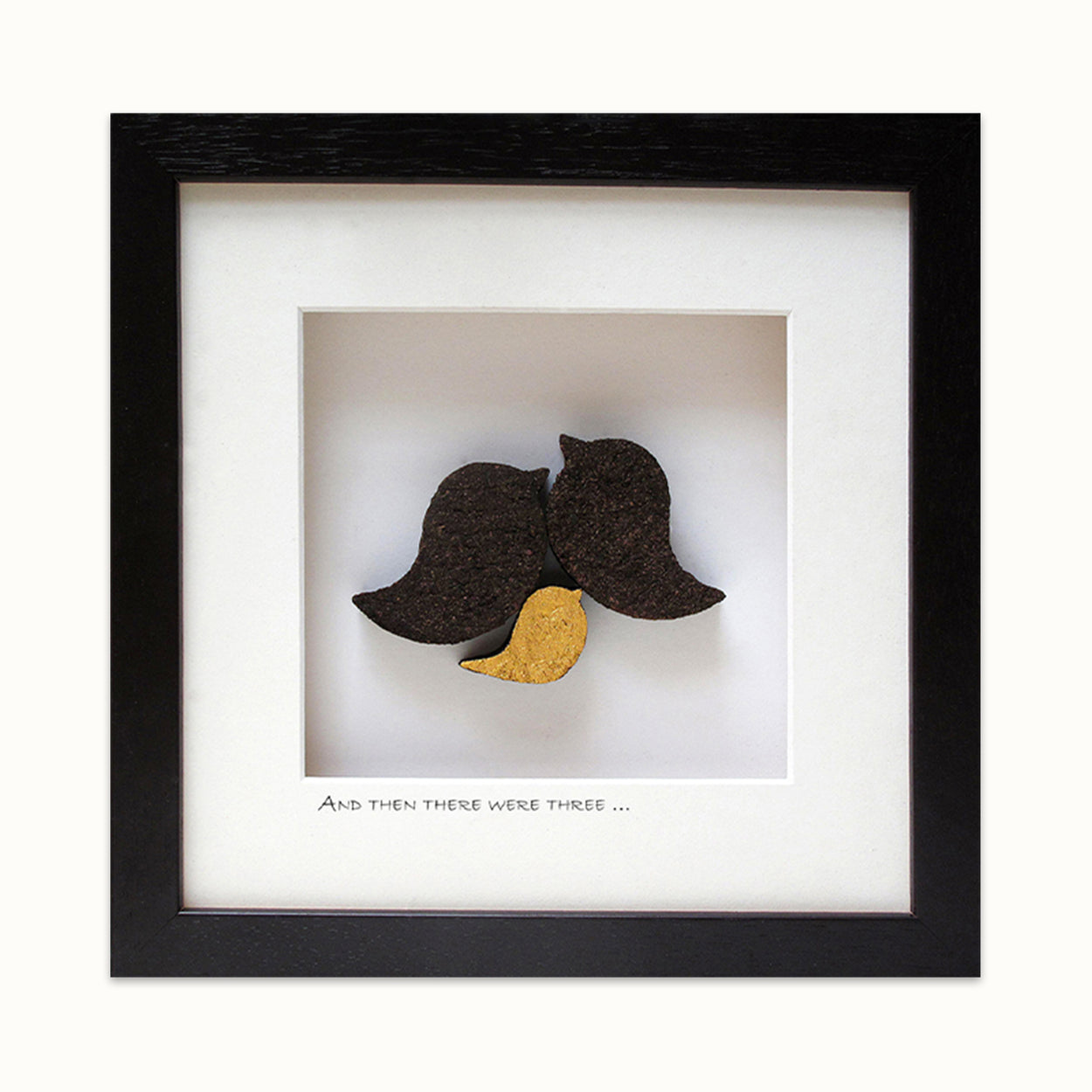 And then there were three is a stylish new baby gift handmade in Ireland from real Irish turf. This piece features two love birds proudly and lovingly nestling their new baby.