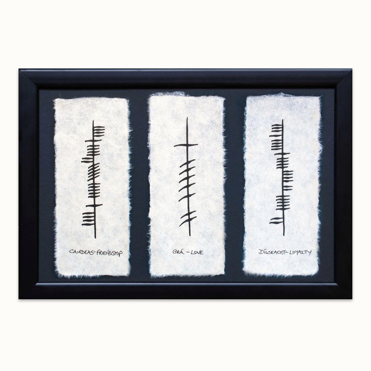 Written in Ireland's most ancient script - the wishes Friendship, Love & Loyalty are individually hand-painted onto hand-made paper and presented in a sleek black wooden frame. Each piece is hand-crafted by Ethel Kelly in her workshop in Knockcroghery, Co. Roscommon, Ireland.