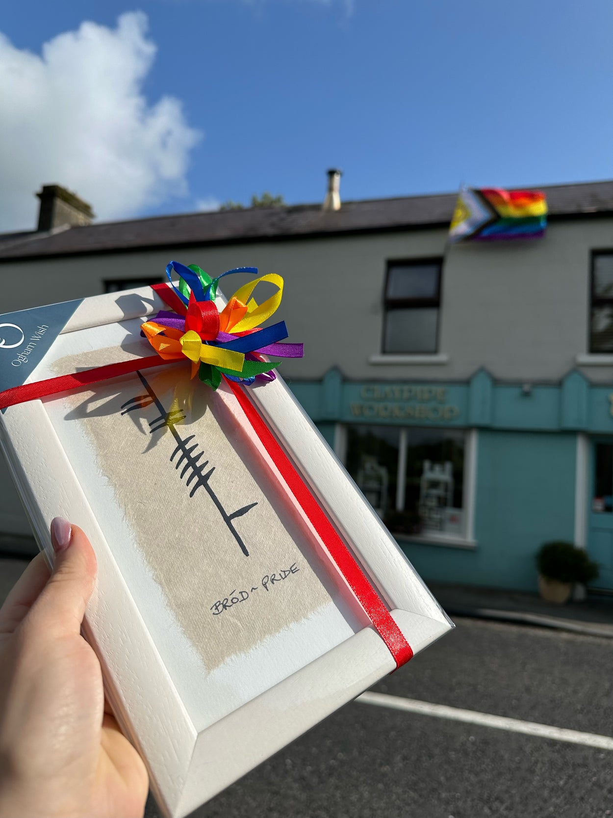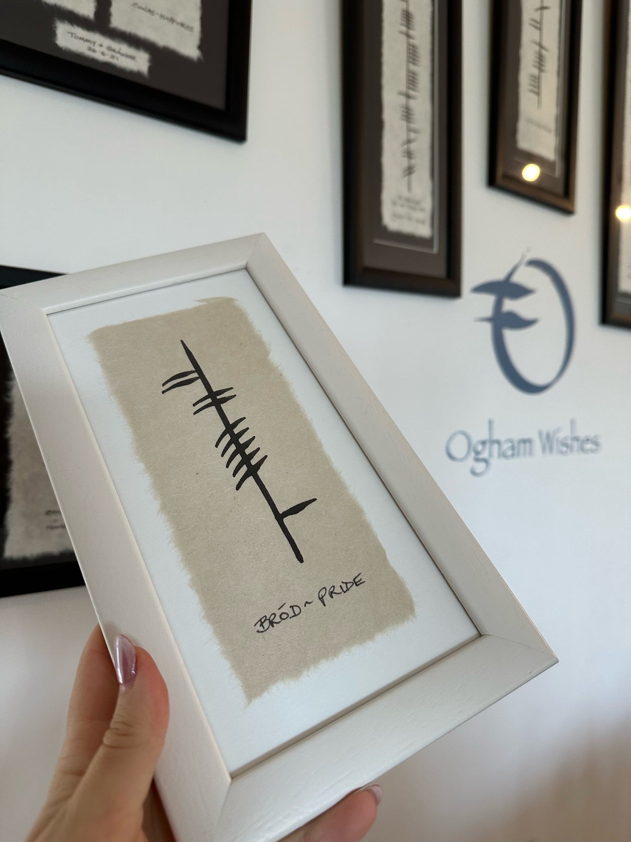 Pride - Bród. Show your pride with our Bród - Pride hand-painted in Ireland’s ancient script ogham. It is a beautiful gift suitable for a number of occasions such as weddings, engagements, birthdays or gifts to self (the best kind of gifts!)