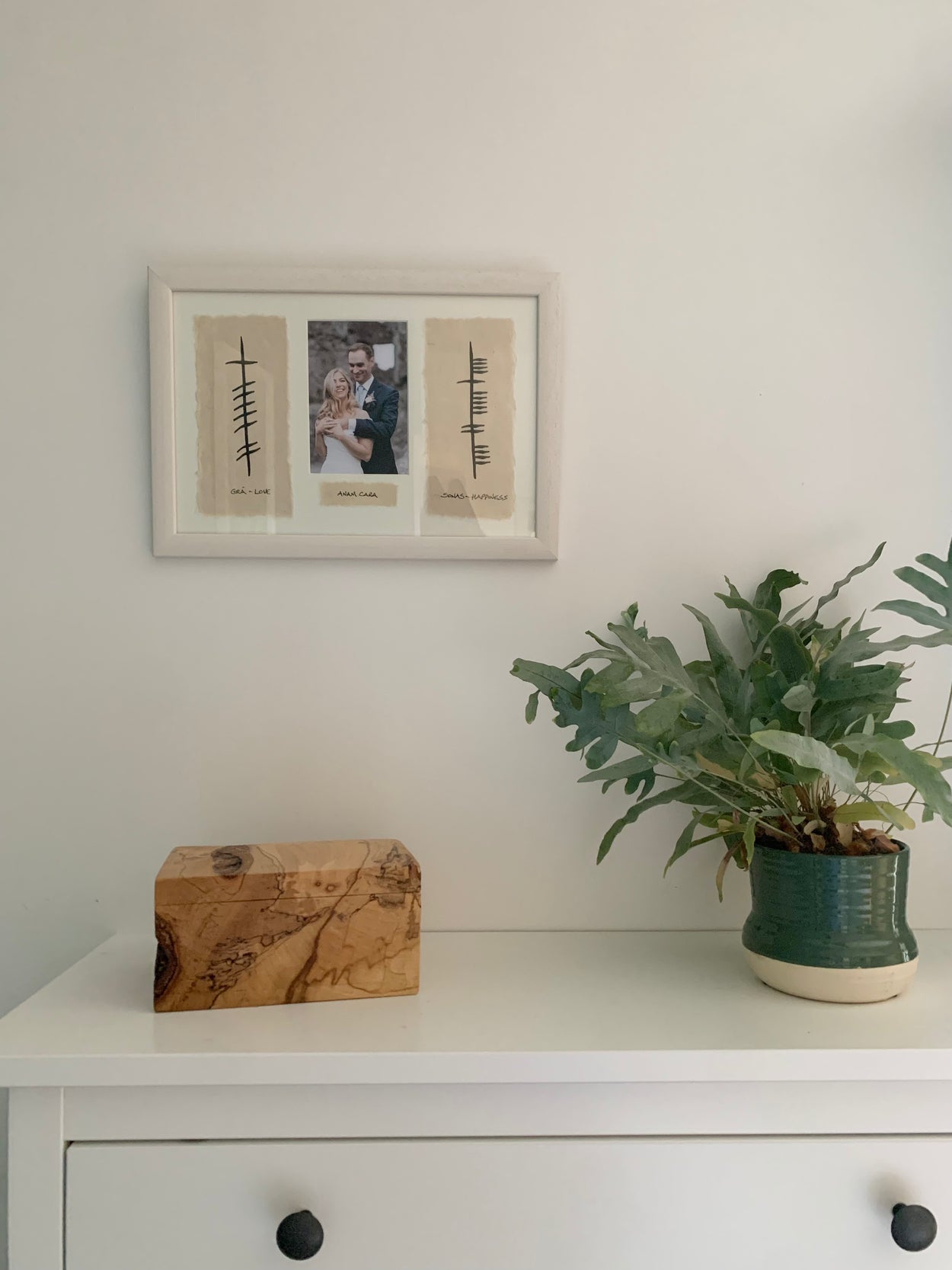 The Ogham Love & Happiess Plaque is our newest addition to our White Collection. This stunning hand-crafted gift is perfect for weddings, engagements or anniversaries gifts. Love & Happiness specially painted along with space for a photo, to celebrate their big day. "Anam Cara” is written under the photo but this can be changed to the couples names and date if preferred.