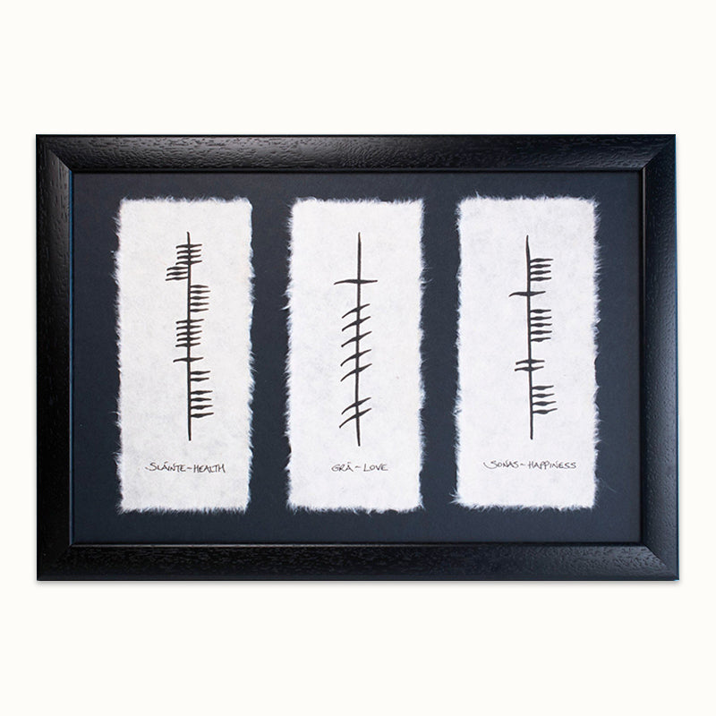 Written in Ireland's most ancient script - the wishes Health, Love & Happiness are individually hand-painted onto hand-made paper and presented in a sleek black wooden frame. Each piece is hand-crafted by Ethel Kelly in her workshop in Knockcroghery, Co. Roscommon, Ireland. Give the gift of Health, Love & Happiness to someone you love from the heart of Ireland!