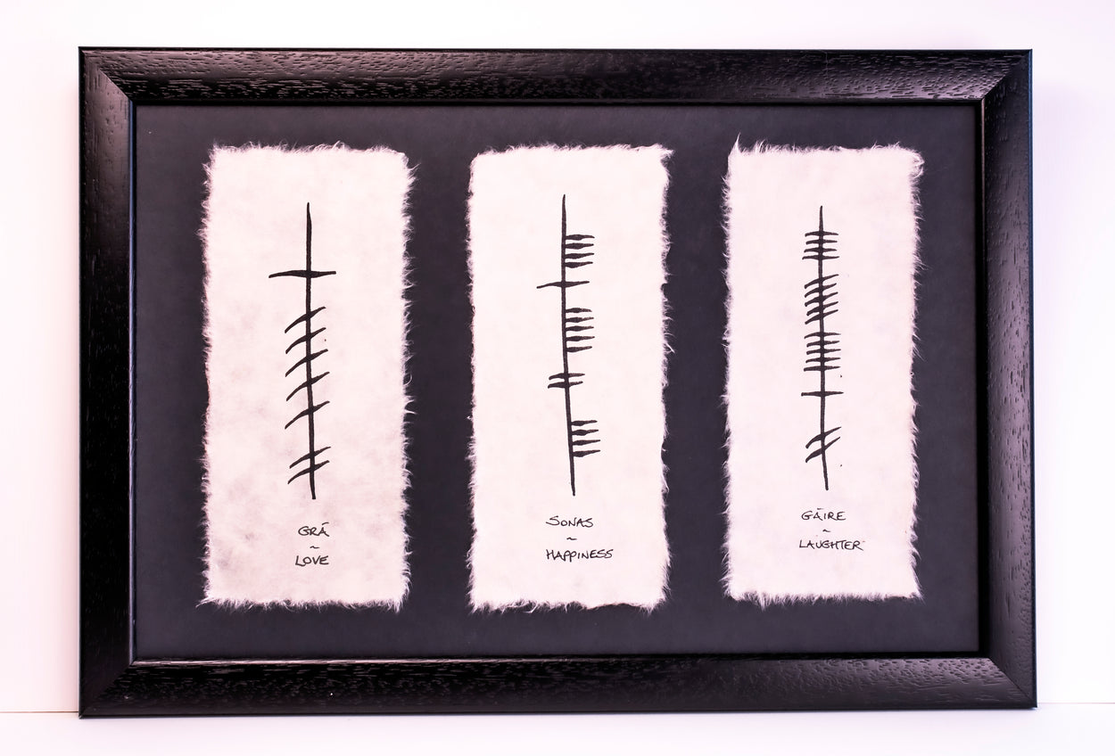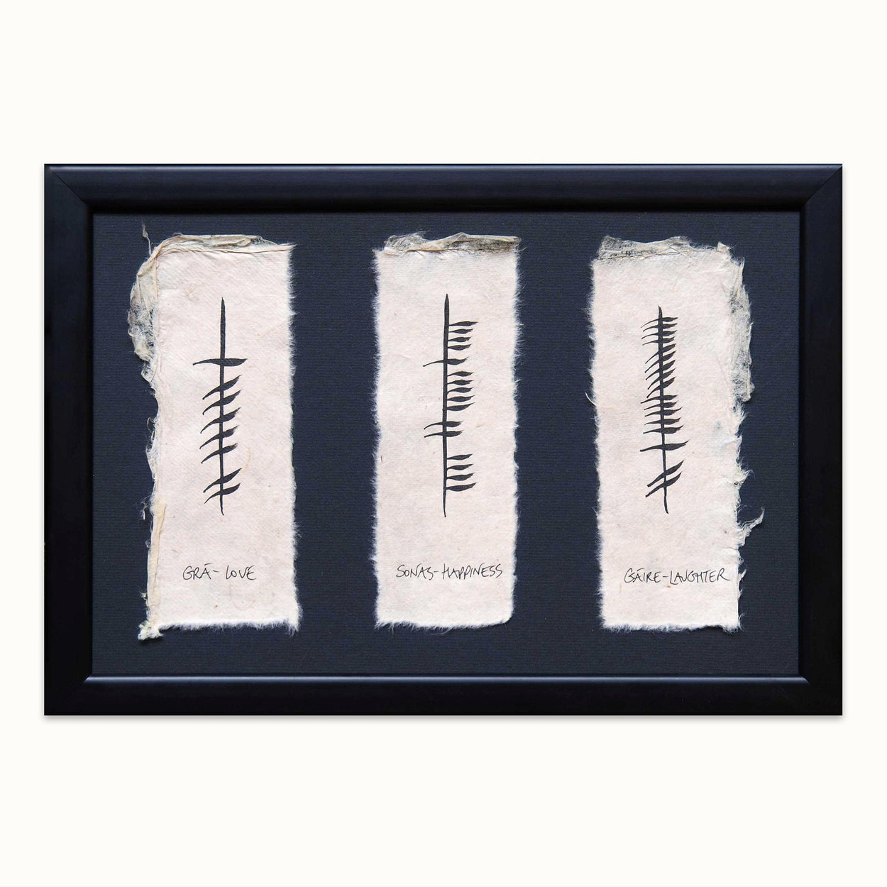 Written in Ireland's most ancient script - the wishes Love, Happiness & Laughter are individually hand-painted onto hand-made paper and presented in a sleek black wooden frame. Each piece is hand-crafted by Ethel Kelly in her workshop in Knockcroghery, Co. Roscommon, Ireland.