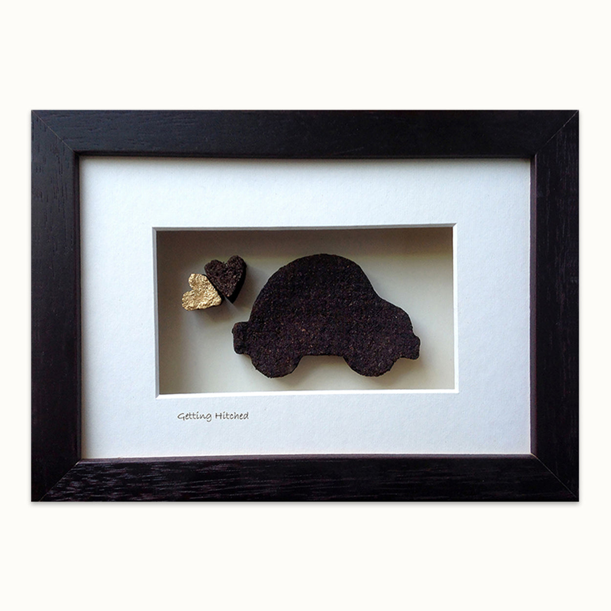 Getting Hitched is a gorgeous wedding and engagement gift hand made in Ireland from real Irish turf. The design features a car followed by two love hearts reminiscent of the tradition of tying cans to the bumper of the matrimonial car!