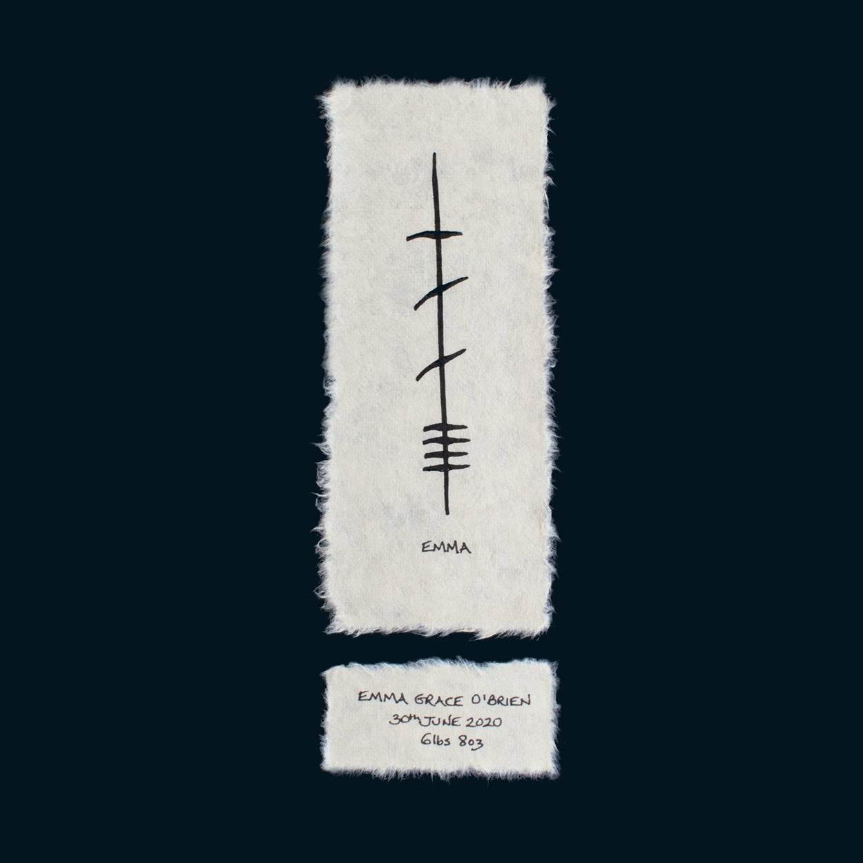 Each Ogham Wish is hand-painted by Ethel Kelly onto hand-made paper in her workshop in Co. Roscommon.