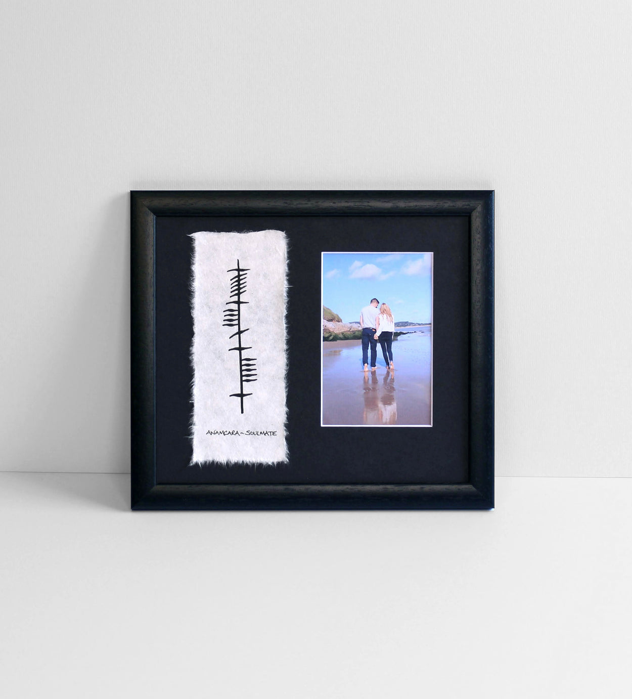 Your soulmate is sure to love this unique, personal, handmade gift of Soulmate - Anamcara hand-painted in ogham. The back of this frame opens up for you to pop in a photo of your favourite memory with your soulmate. Each of our Ogham Wishes are individually hand-painted on to handmade paper and framed in a classic black wooden frame.